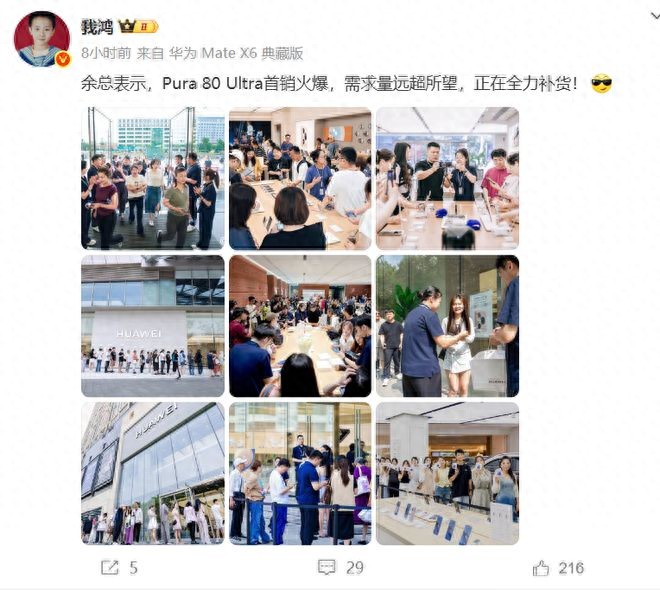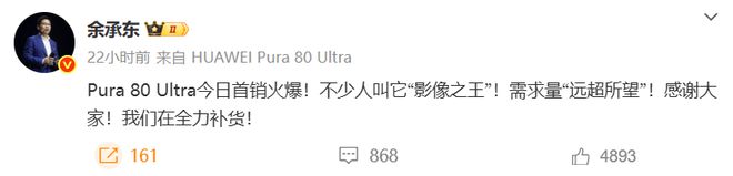 面對(duì)如此火爆的銷售場(chǎng)面,華為常務(wù)董事、終端BG董事長(zhǎng)余承東昨晚通過個(gè)人微博表達(dá)了感謝:“Pura 80 Ultra首銷盛況空前,被譽(yù)為‘影像之王’,需求量遠(yuǎn)遠(yuǎn)超出了我們的預(yù)期。衷心感謝大家的支持!目前,我們正加班加點(diǎn),全力組織補(bǔ)貨。”