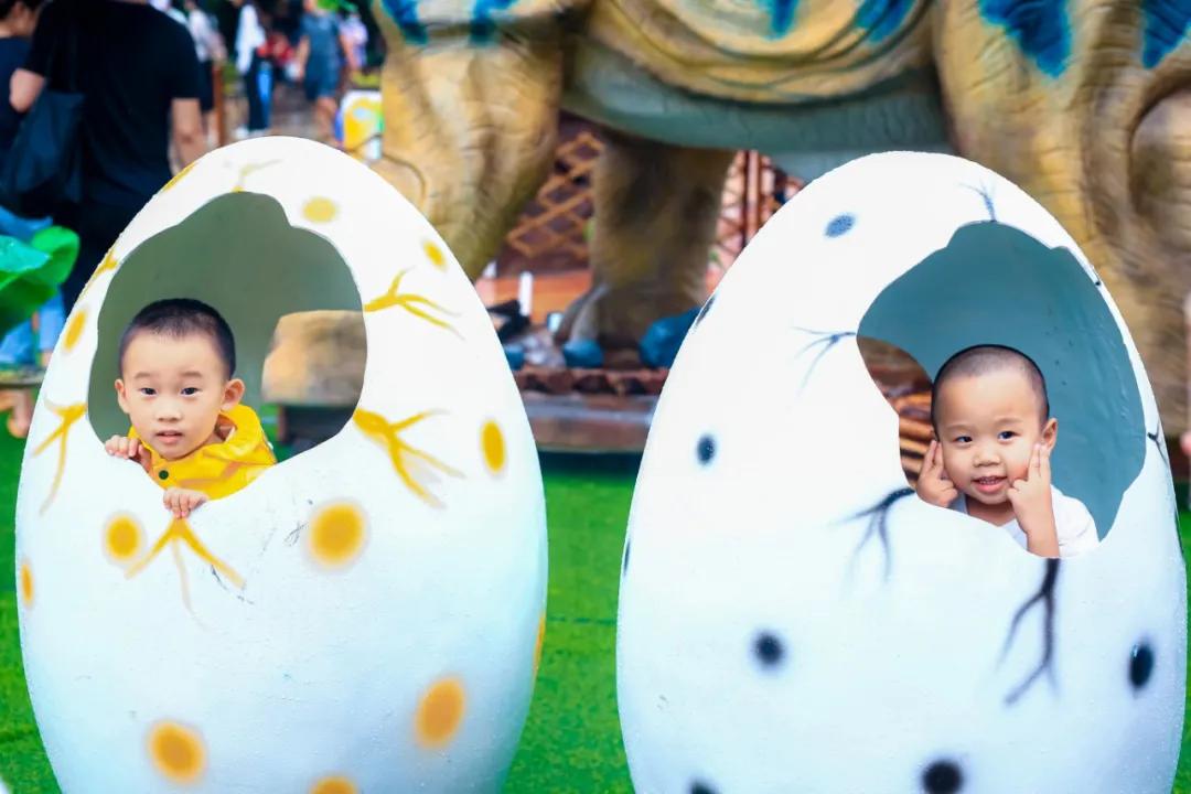 蹲下和恐龍蛋“比個耶”