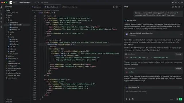 在舊的版本中,Trae在IDE界面中編程,其中編程模式有兩種,分別是Build模式和Chat模式,前者相當于一個傳統編程的IDE界面,只需要用戶在右側輸入提示詞,AI就能自動拆解,按照需求生成大段編碼。相比之下,Chat模式則更多適用于用戶和AI通過聊天的方式,修改編碼、找問題等等,更適用于精細調整上。