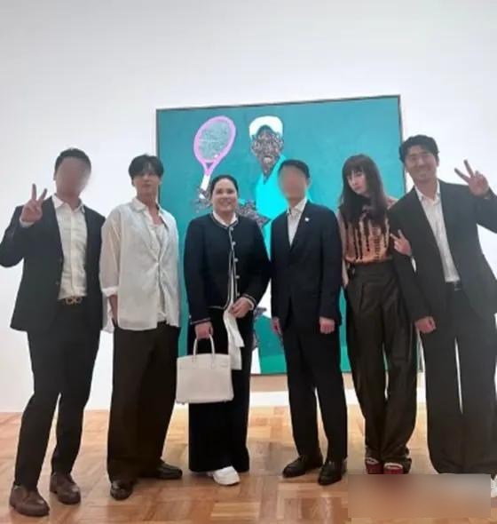 夫妻倆在美術館一幅畫前和朋友聊天,看起來聊得挺認真。元斌雙手插在褲兜,李奈映拿著手機拍照,雖然穿得普通但個子高,一眼就能認出來。之前元斌最后一次露面是參加演員金賽綸的葬禮,之后再沒拍過新作品,這些年基本沒在公開場合和妻子一起出現過。