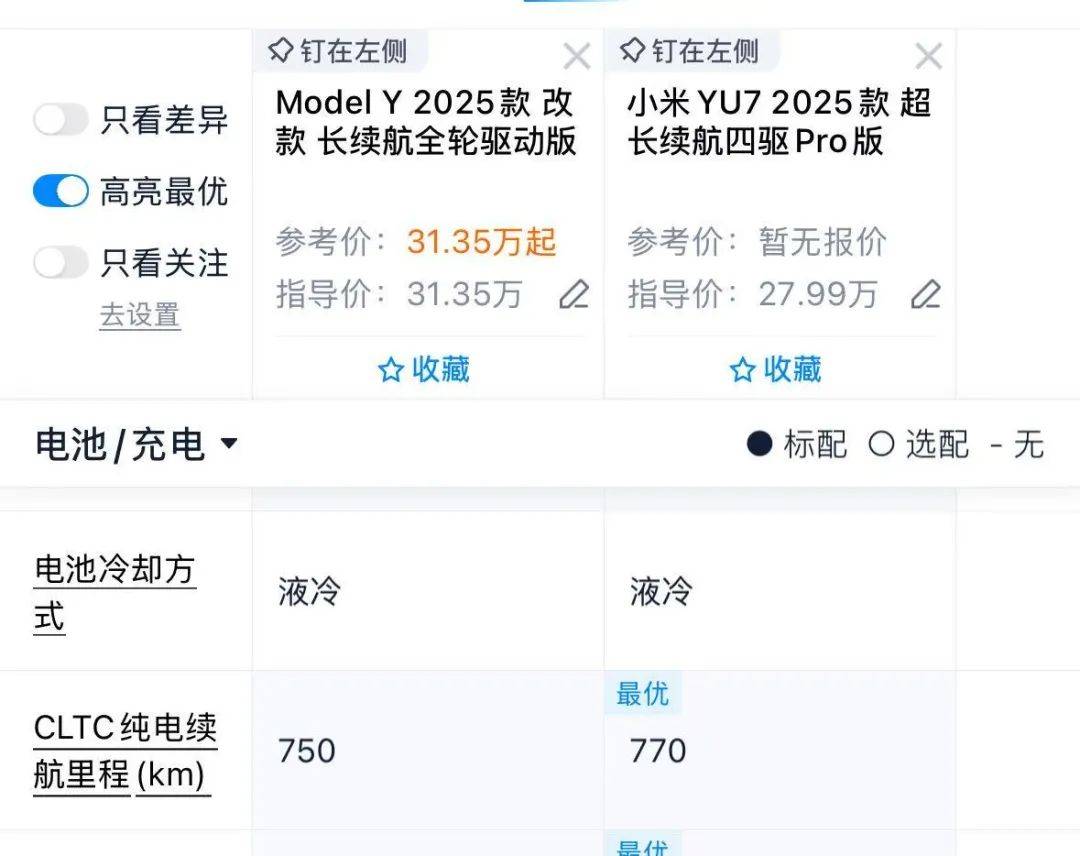 特斯拉Model Y長續全驅版采用78.4度的LG電池,CLTC續航750公里,小米YU7采用的則是96.3度的寧德時代電池,CLTC續航770公里。從這組數據和重量差異來看,確實能在一定程度上體現特斯拉三電技術(電機、電控、電池管理)的優勢。首先是能耗效率差距明顯:特斯拉Model Y用78.4度電跑750公里,折算下來百公里電耗約10.45度;而小米YU7以96.3度電跑770公里,百公里電耗約12.5度。即使扣除YU7重400公斤可能增加的能耗(按每100公斤多1度電估算,約多4度/百公里),其基礎電耗仍高于Model Y,說明特斯拉在電機效率、電控精準度上更優。