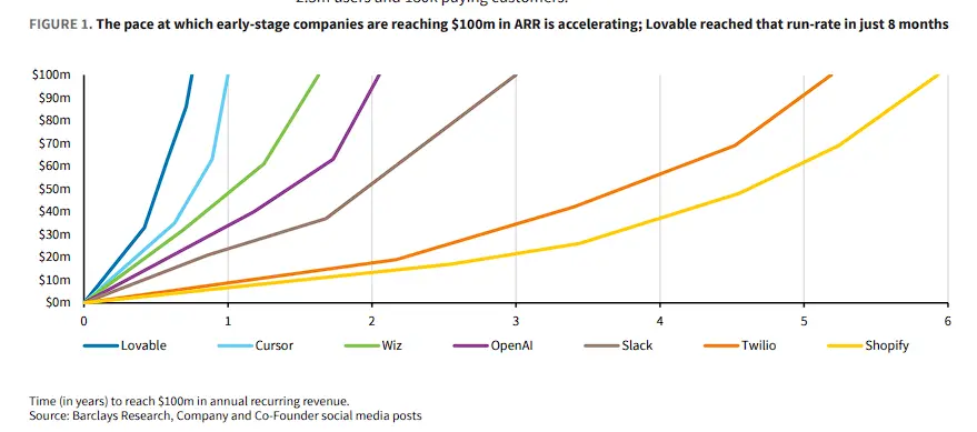 據巴克萊研究報告顯示,該公司僅用8個月就達到了1億美元ARR,成為達成這一里程碑最快的公司之一,這一速度超過了Cursor、OpenAI、Slack等知名科技公司的早期增長記錄。