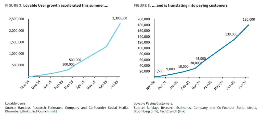 一家成立僅一年的AI建站工具Lovable正以前所未有的速度重塑網站開發市場。8月2日,據追風交易臺消息,巴克萊在最新研報中稱,AI建站工具Lovable在8個月內達到1億美元年度經常性收入(ARR),超越了Cursor等知名AI工具的增長速度,并在18億美元估值下完成2億美元A輪融資。