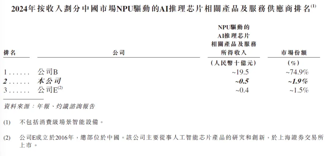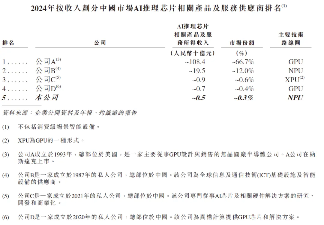 從招股書的注釋中推斷,在2024年中國市場AI推理芯片相關(guān)產(chǎn)品及服務(wù)供應(yīng)商排名的表中,公司A和B是英偉達和華為,公司C和D大概率是百度昆侖芯和沐曦。在另一張NPU市場排名的表中,公司E是寒武紀。