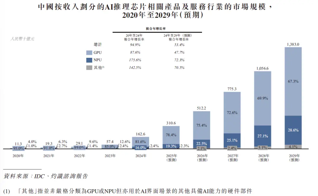 誠然按照灼識咨詢報告顯示,未來AI推理芯片和NPU將是一個龐大的市場。中國AI推理芯片相關(guān)產(chǎn)品及服務(wù)行業(yè),預(yù)計于2024年至2029年將以53.4%的復(fù)合年增長率增長,2029年行業(yè)空間將達到人民幣13830億元;NPU在AI推理芯片中的滲透率預(yù)計將達到28.6%。