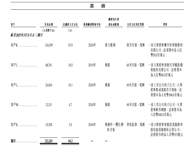 關(guān)于這部分業(yè)務(wù)具體出貨做什么,云天勵飛并未解釋。但我們能知道的是,這部分的營收一半由單一大客戶貢獻。作為佐證,在2024年的前五大客戶中,客戶K買了1.1億的算力服務(wù),占整個業(yè)務(wù)收入占比的44%。2025年一季度,客戶K基本上承包了所有的營收。