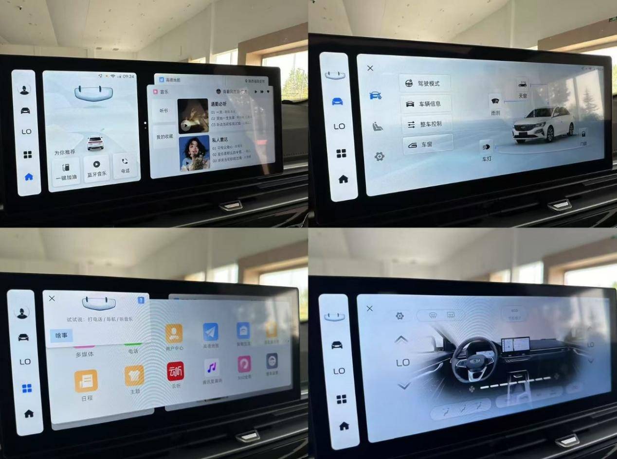 第4代帝豪400萬紀念款標配了雙大屏+銀河OS,實現車機不拖后腿,10.25英寸全液晶儀表盤+12.3英寸中控大屏,內置億咖通E02芯片,清晰度和反應速度雖然不及造車新勢力,但在6萬級車型中值得肯定,銀河OS不僅界面簡潔,還支持三指飛屏、語音操控等交互體驗。喜馬拉雅、酷我、愛趣聽等常用娛樂App應有盡有,開車不怕無聊。
