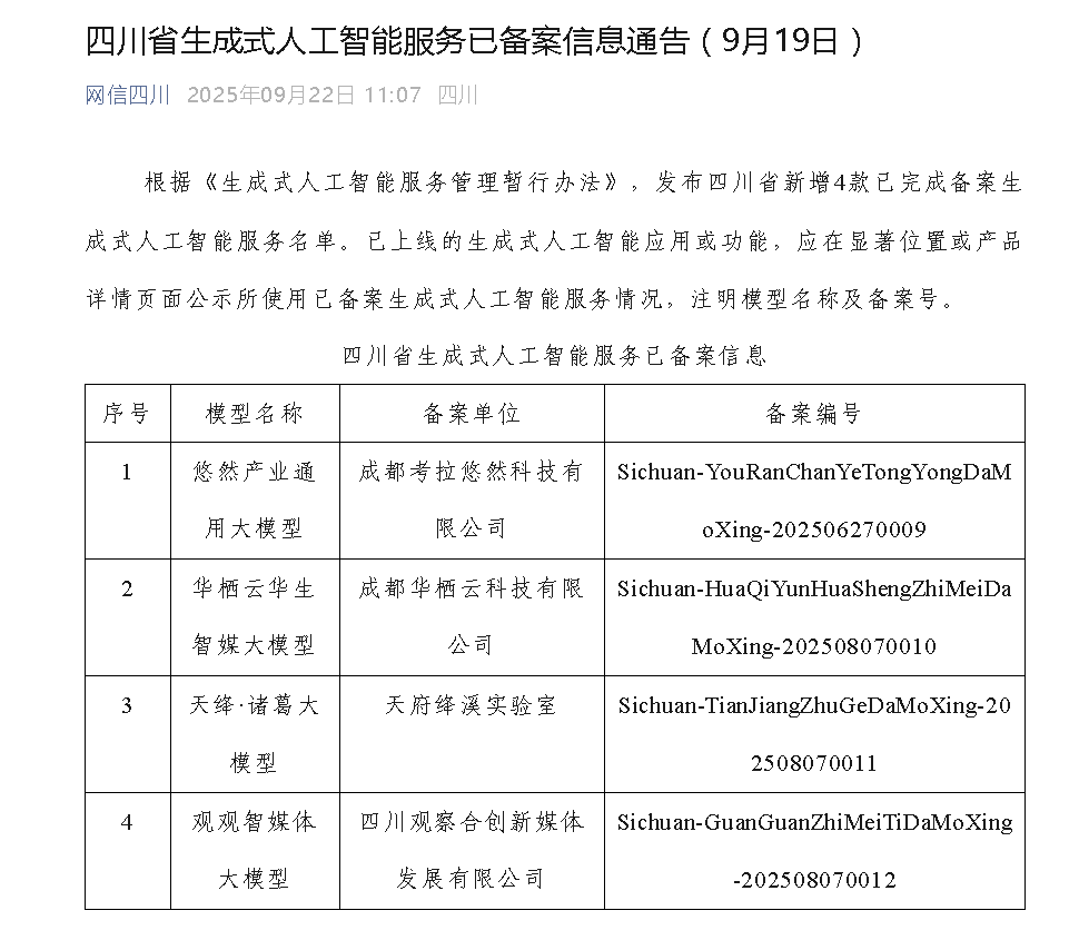 近日,四川省網信辦公布了四川新增的4款已完成備案的生成式人工智能服務名單,模型名稱分別是悠然產業通用大模型、華棲云華生智媒大模型、天絳·諸葛大模型、觀觀智媒體大模型,備案單位分別為成都考拉悠然科技有限公司、成都華棲云科技有限公司、天府絳溪實驗室、四川觀察合創新媒體發展有限公司。公告表示,已上線的生成式人工智能應用或功能,應在顯著位置或產品詳情頁面公示所使用已備案生成式人工智能服務情況,注明模型名稱及備案號。