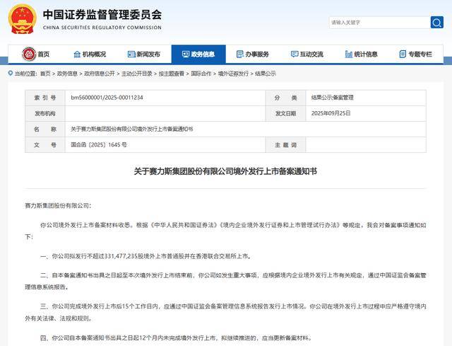 此外,值得關(guān)注的是,9月25日,中國證監(jiān)會(huì)國際合作司發(fā)布公告,對賽力斯集團(tuán)股份有限公司境外發(fā)行上市予以備案。