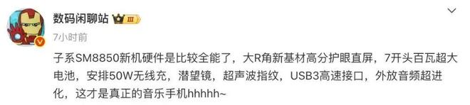 另外,博主@數碼閑聊站 此前的一份爆料顯示,一款子系SM8850新機硬件比較全能,配備大R角新基材高分護眼直屏,內置7開頭百瓦超大電池,支持50W無線充,還配有潛望鏡、超聲波指紋、USB3高速接口,外放音頻超進化。