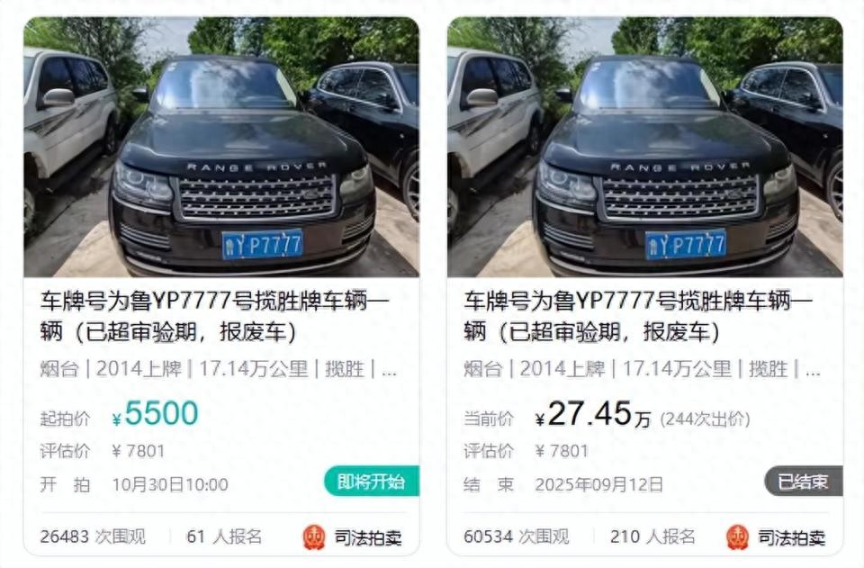 22日,記者注意到,在阿里拍賣平臺上,一臺車牌號為魯YP7777的報廢路虎越野車,將以5500元的價格掛網拍賣,目前已有57名競買人報名參拍。