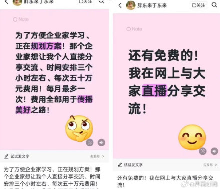 10月21日,胖東來創(chuàng)始人于東來在社交平臺個人賬號發(fā)文稱:“為了方便企業(yè)家學(xué)習(xí)、正在規(guī)劃方案!哪個企業(yè)家想讓我個人直接分享交流、時間安排三個小時左右、每次五十萬元費(fèi)用!每月最多一次!費(fèi)用全部用于傳播美好之路!”