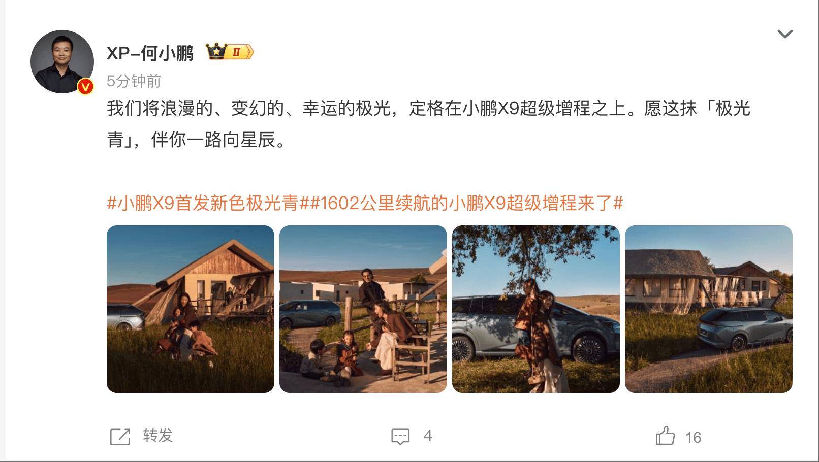 10月23日,董事長(zhǎng)何小鵬發(fā)文宣布,小鵬X9超級(jí)增程首發(fā)新色極光青。