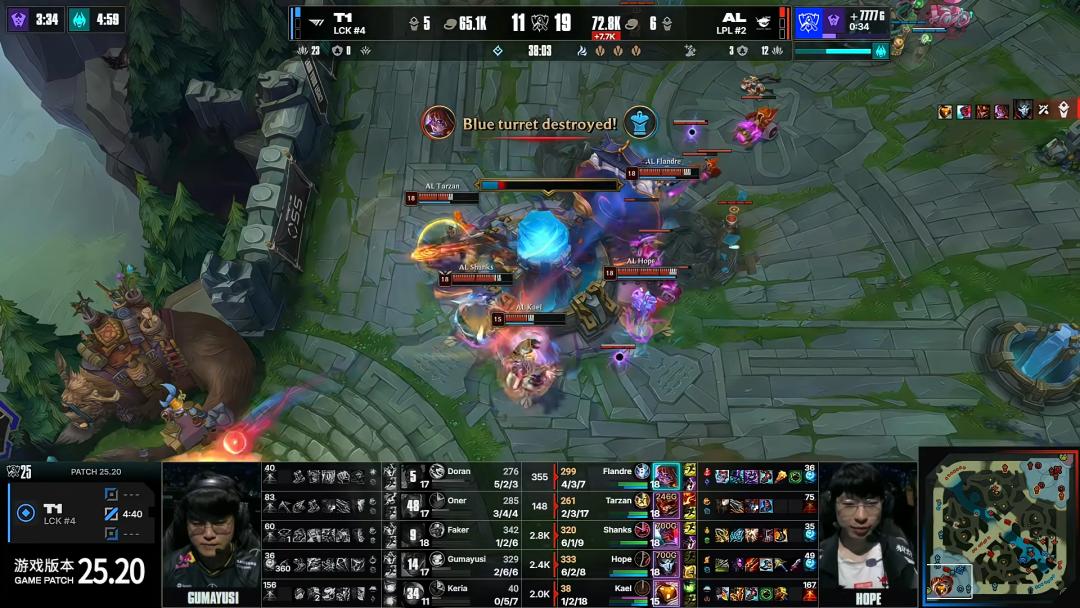 最后的決勝局,AL主帥Tabe押寶HOPE的個人能力,讓選擇了金克斯、璐璐、豬妹的保護發(fā)育組合,但T1拿出了梅爾、薩勒芬妮、艾希這三個擅長遠程攻擊的英雄進行應對。沒有了KAEL的開團,AL戰(zhàn)隊遭到了T1的遠距離消耗,AL對線階段全面劣勢,T1拿到了小龍、巢蟲等中立資源。
