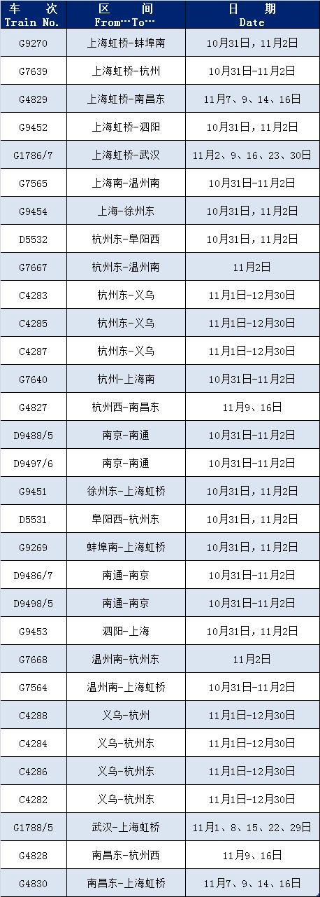 ◆ 短期集中:10月31日-11月2日(如 G9270、G7639、G9452等多車次集中增開(kāi)),應(yīng)對(duì)階段性客流高峰。