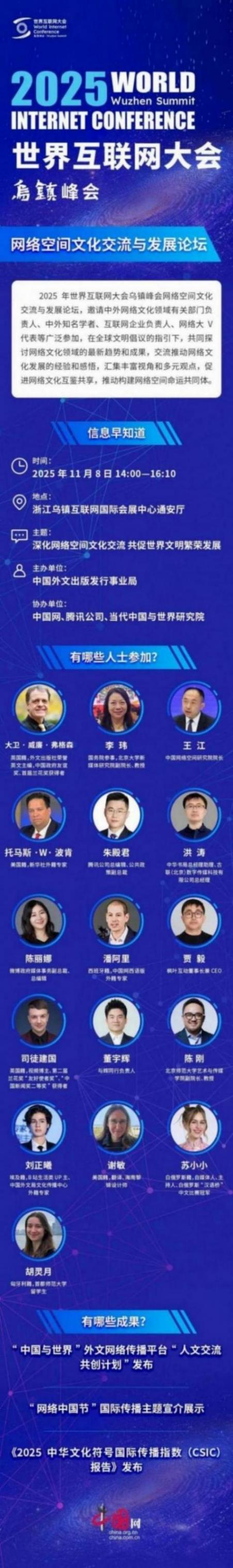 2025 年世界互聯網大會烏鎮峰會網絡空間文化交流與發展論壇,邀請中外網絡文化領域有關部門負責人、中外知名學者、互聯網企業負責人、網絡大V代表等廣泛參加,在全球文明倡議的指引下,共同探討網絡文化領域的最新趨勢和成果,交流推動網絡文化發展的經驗和感悟,匯集豐富視角和多元觀點,促進網絡文化互鑒共享,推動構建網絡空間命運共同體。