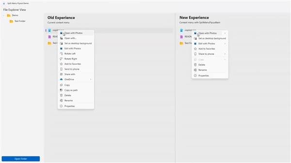 11月6日消息,Windows 11發布四年后,其文件資源管理器中的右鍵菜單終于要迎來一次重大更新,以解決用戶長期以來抱怨的混亂和冗余問題,微軟將這一新UI設計命名為“拆分式右鍵菜單”(Split Context Menu)。