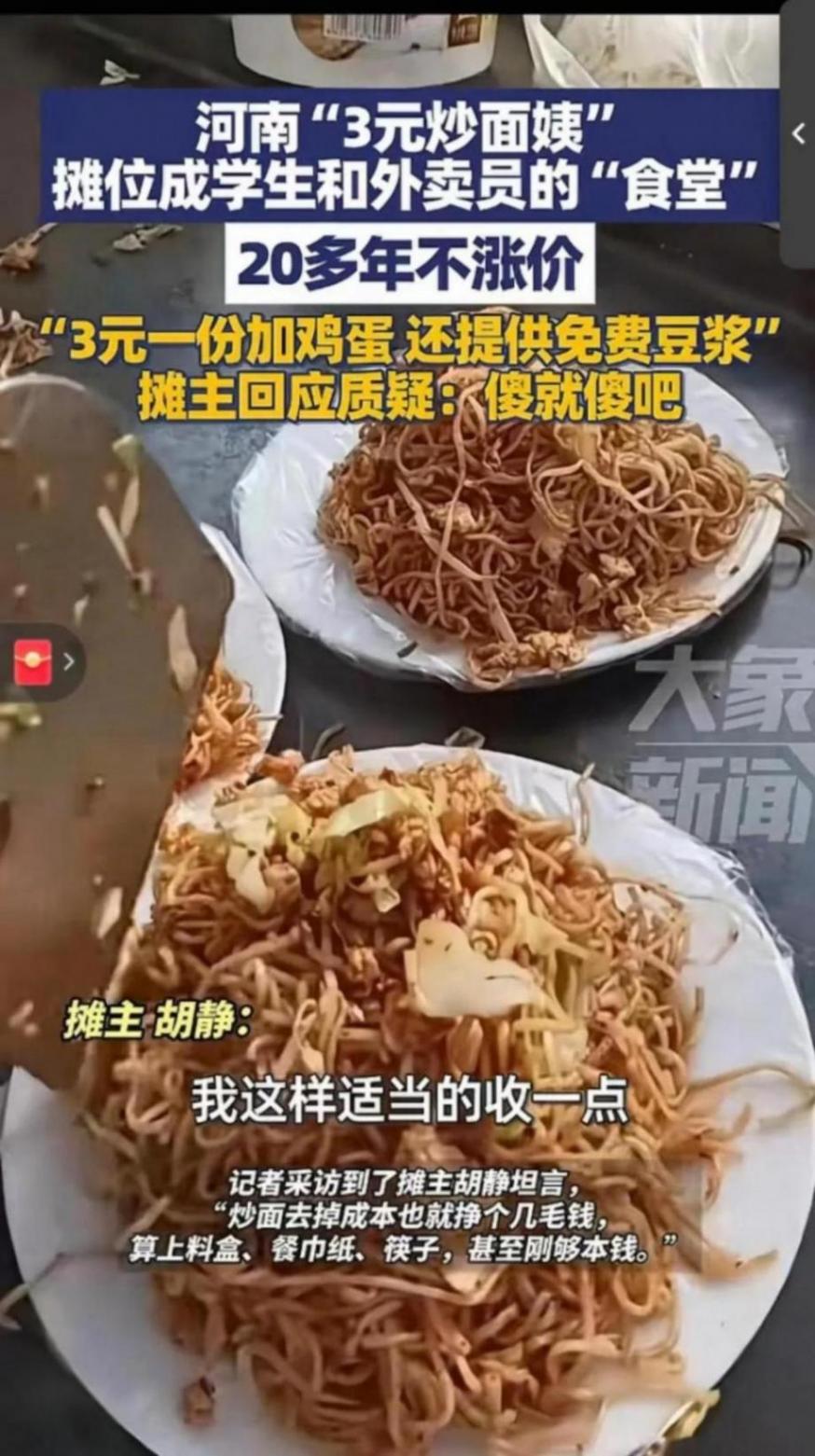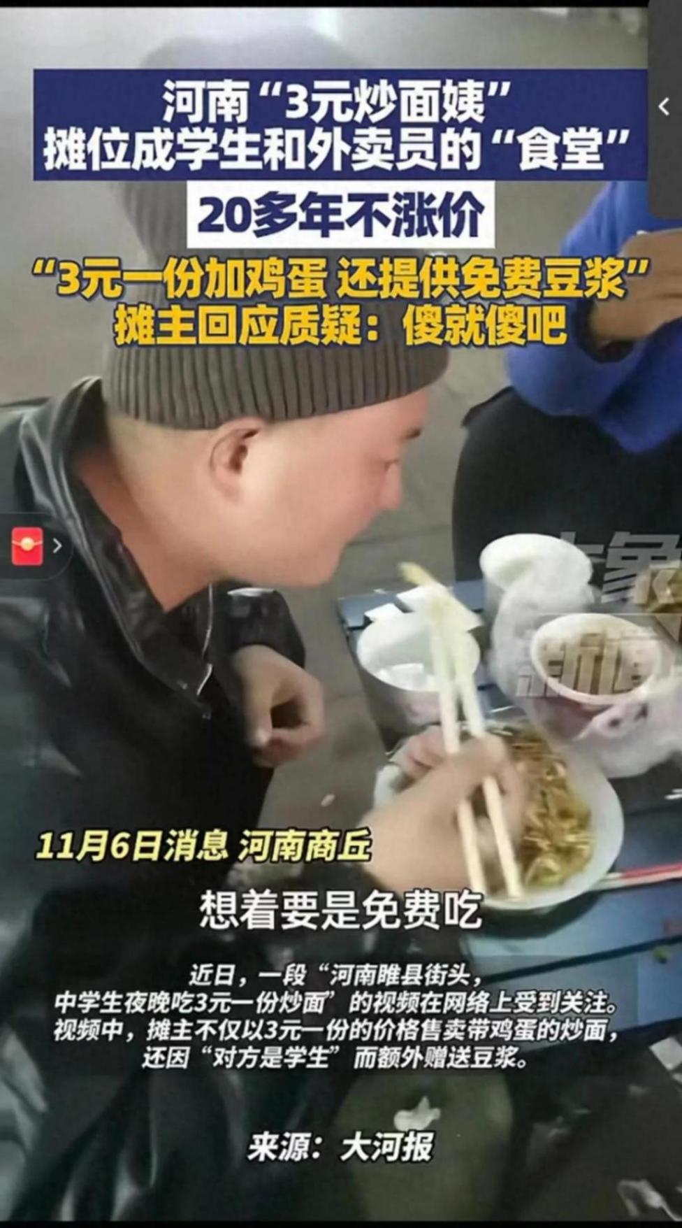 視頻在社交平臺發酵后,相關話題收獲數萬點贊。網友們紛紛留言:“3塊錢能吃到帶雞蛋的炒面還送豆漿,這才是民生溫度”“質疑的人不懂,這是平凡人的善意”“河南果然多實在店家,這份堅守太動人”。有網友感慨,在物價飛漲的當下,這樣的平價小攤不僅解決了剛需,更傳遞了久違的溫暖,“希望這份善意能被溫柔以待”。