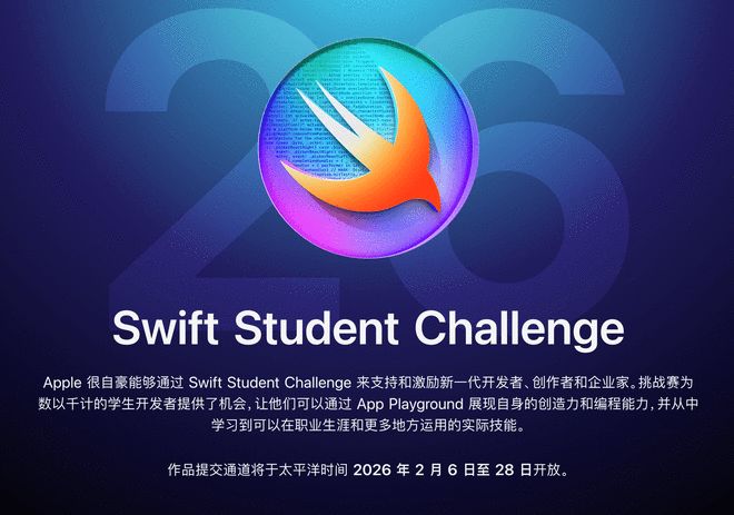 蘋果2026 Swift學(xué)生挑戰(zhàn)賽將為全球?qū)W生開發(fā)者提供展示能力的舞臺(tái),學(xué)生開發(fā)者可以運(yùn)用Swift編程語言和Xcode等編程工具,解決當(dāng)前的各類現(xiàn)實(shí)問題。2026年的挑戰(zhàn)賽作品提交通道將開放三周。