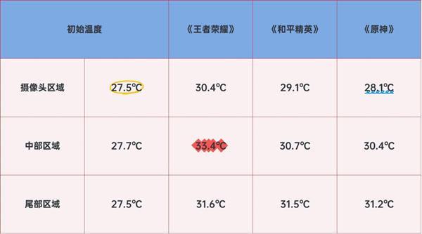 兩局《王者榮耀》后,各區域溫度僅升至28.1℃-30.4℃;一局《和平精英》后,最高溫度出現在攝像頭區域,為33.4℃。