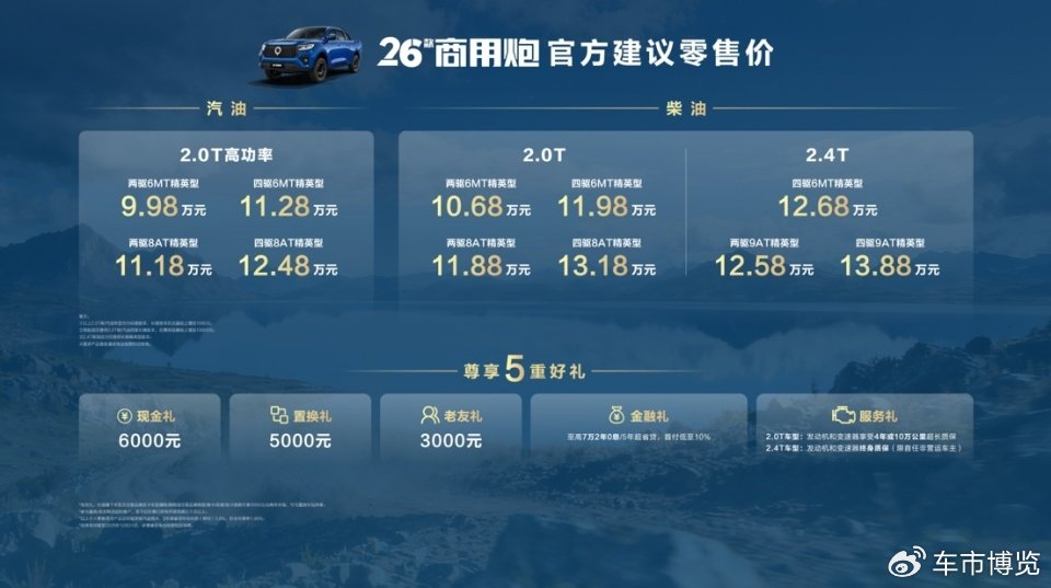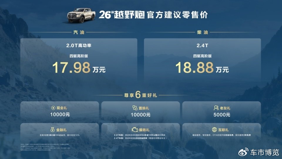 11月21日,2026款在廣州車展煥新上市,引領(lǐng)皮卡品類價(jià)值再躍升!2026款商用炮官方建議零售價(jià)為9.98萬(wàn)元-14.28萬(wàn)元,2026款乘用炮官方建議零售價(jià)為12.68萬(wàn)元-16.88萬(wàn)元,2026款越野炮官方建議零售價(jià)為17.98萬(wàn)元-18.88萬(wàn)元。