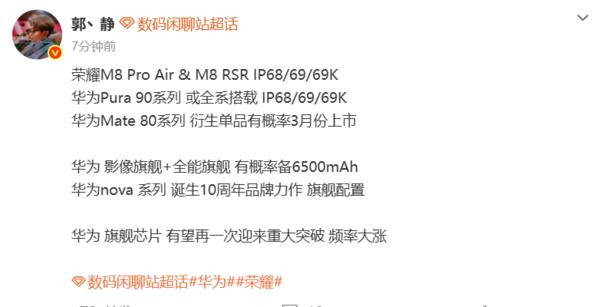 1月8日,博主“郭丶靜”透露了榮耀與華為多款新品的相關信息,涉及防水等級、新品上市時間等多個方面。