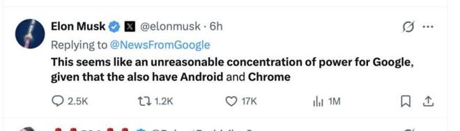“考慮到谷歌已經(jīng)控制了Android和Chrome,這樣的合作將導致不合理的權力集中。”馬斯克在X上寫道。