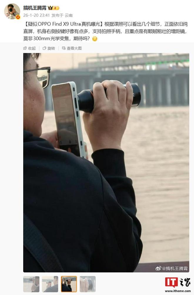 1 月 21 日消息,博主 @搞機王騰霄 昨晚分享了 OPPO Find X9 Ultra 的真機諜照。圖片顯示,新機正面依舊純直屏,支持拍照手柄,機身右側(cè)配備多枚按鍵,畫面還重點展示了一顆體型“碩大”的增距鏡(博主猜測有望支持 300mm 光學(xué)變焦)。