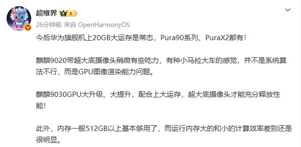 該博主表示,這一配置并非單純堆料,而是為匹配超大底影像系統(tǒng)與新一代處理器的性能需求。據(jù)該博主分析,為了避免因為GPU圖像渲染能力受限,導(dǎo)致高像素傳感器無法完全發(fā)揮潛力,出現(xiàn)“小馬拉大車”的現(xiàn)象,華為新一代平臺在GPU性能上實現(xiàn)了顯著提升,配合20GB大運存,能充分釋放超大底攝像頭的計算攝影潛能。