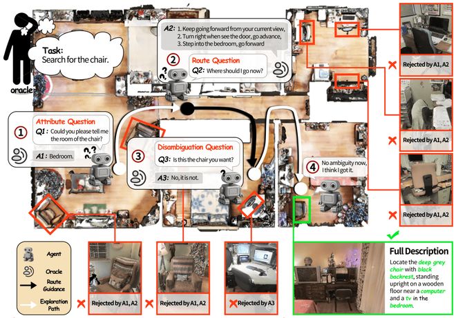 交互式實例導航示例:用戶要求機器人找到場景中某一張凳子(綠框),但存在大量相似干擾項(紅框),因此機器人需在探索中結合觀察主動提問,逐步縮小候選范圍,直到鎖定目標。