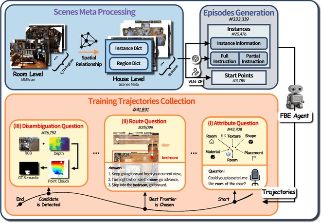 交互導航軌跡采集:該階段主要采用一個集成了基于邊界點的探索算法(Frontier-Based Exploration)與目標實例分割器的智能體。在數據采集過程中,智能體除探索未知區域外,還會按規則主動提出三類問題:屬性(目標實例長什么樣?)、路線(如何到達目標?)和目標消歧(是否為眼前的實例?),從而生成相應的交互式導航軌跡。