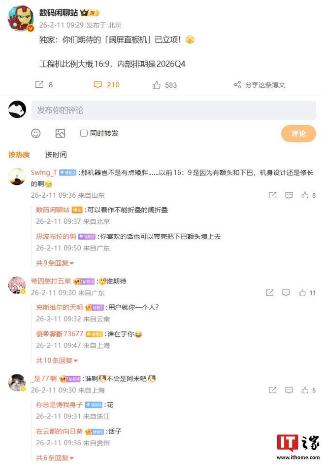 2 月 11 日消息,博主 @數碼閑聊站 今日發文透露,大家期待的「闊屏直板機」已立項,工程機比例大概 16:9,內部排期是 2026 年 Q4。結合評論區討論來看,該機預計歸屬華為品牌。
